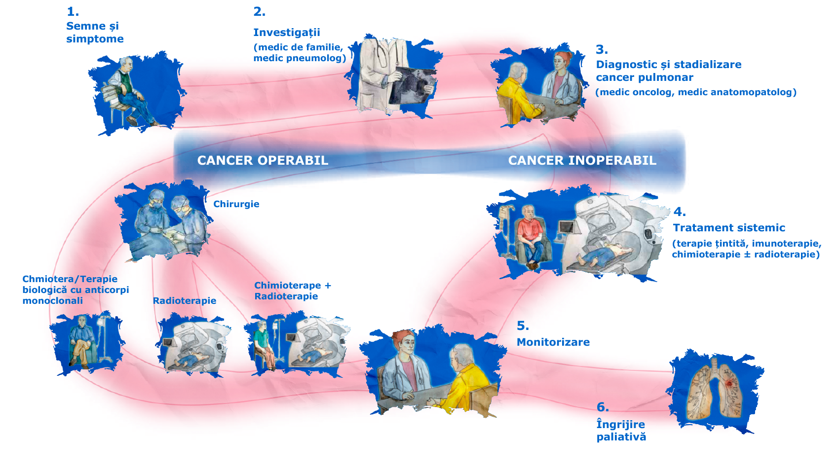 • Îngrijirea paliativă ce trebuie să se facă din primele stadii de boală și să asigure confortul vieții pacientului și familiei acestuia. În acest sens, medicul oncolog curant ar trebui să ofere variante de tratament paliativ, adrese ale instituțiilor cu îngrijiri paliative, asociații medico-sociale, îngrijiri paliative la domiciliu, etc.